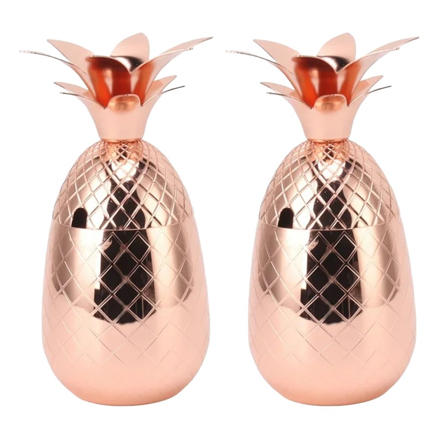 M93 Mug de acero inoxidable electro plateado en cobre en forma de piña. Presentación caja de cartón negro de 2 copas con cama de politileno extendido. Tamaño Piña Ø9,3 x 17,5 cms. Tamaño Bombilla Ø0,6 x 17 cms. Capacidad 250 ml. Material Cuerpo Acero Inox. SS 304 Material Tapa Zamak Packing 1 set Embalaje Master 12 sets Tamaño Caja Master 60 x 51 x 35cms. Peso Caja Master 11,4 Kg. Opciones de Personalización