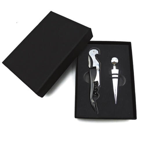 W5 Set de vino en caja de cartón duro negro que incluye: S acacorchos y tapón para vino. Accesorios de acero inoxidable. Tamaño 13,2 cms x 10 cms x 3 cms. Presentación Caja de Cartón Negra. Placa Dorada 17 x 7 cms. Embalaje 1 Set Embalaje Master 32 Sets. Tamaño Caja Master 29,5 x 22 x 27 cms. Peso Caja Master 6 Kg. Opciones de Personalización