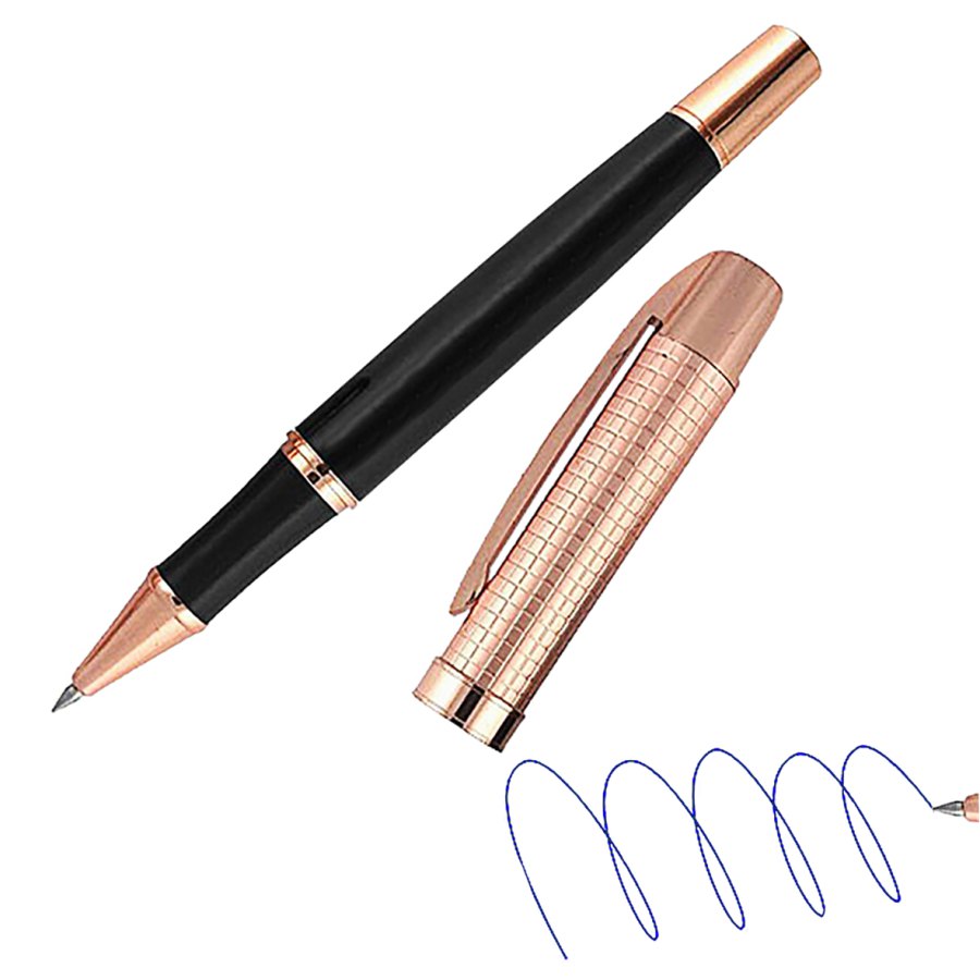 L76 Roller encobrizado negro de finas terminaciones. Acabado brillante. Tamaño Ø 1.39 cms. x 14 cms. Material Metálico electro plateado en color cobre y negro Escritura Azul. Packing 50 unidades Embalaje Master Caja de 500 unidades Tamaño Caja Master 30 cms x 28 cms x 25 cms. Peso Caja Master 21 kgs.