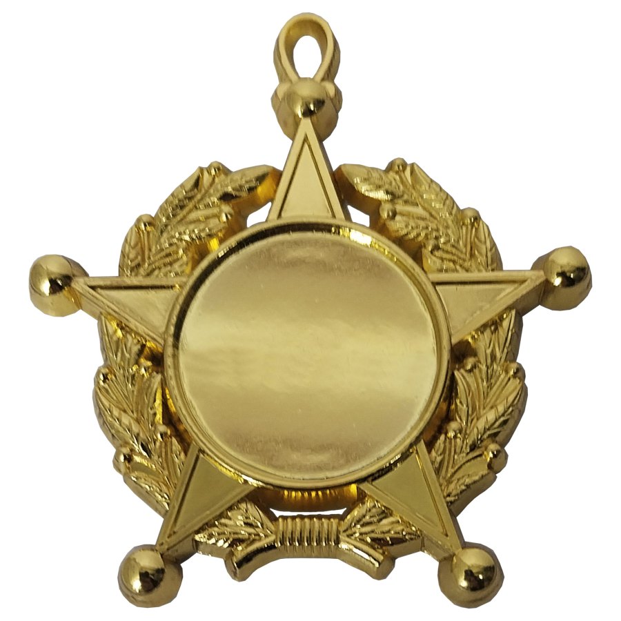 CON02 Condecoración Estrella Laurel. *Venta por unidad. Dimensiones Medalla 57 x 62mm Insert Ø25 mm. Packing caja 25 unds. Packing Máster 500 unds. Tamaño Caja Máster 29x22x15 cms. Peso Caja Máster 15,5 kgs. Opciones de Personalización