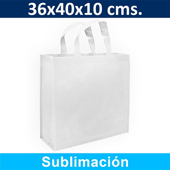 Bolsas Sublimable Bolsa publicitaria de TNT sublimable (tela no tejida) disponible en diferentes tamaños. Liviana, resistente y reutilizable, con asas termoselladas que garantizan mayor resistencia y seguridad. MOD. Dimensiones Embalaje Master Packing Peso Caja Master SUB-G22 25 x 30 x 8 cms. 36,5 x 26,5 x 46,5 cms. 200 unds. 6 Kgs. SUB-G44 30 x 40 x 12 cms. 43 x 39 x 46,5 cms. 200 unds. 10,5 Kgs. SUB-G77 18 x 28 cms. 38,5 x 31 x 25 cms. 200 unds. 4 Kgs. SUB-G88 36 x 40 x 10 cms 48 x 38,5 x 48 cms. 200 unds. 10 Kgs. Opciones de Personalización Sugerencia de sublimación : 150° Celsius con 60 Segundos.