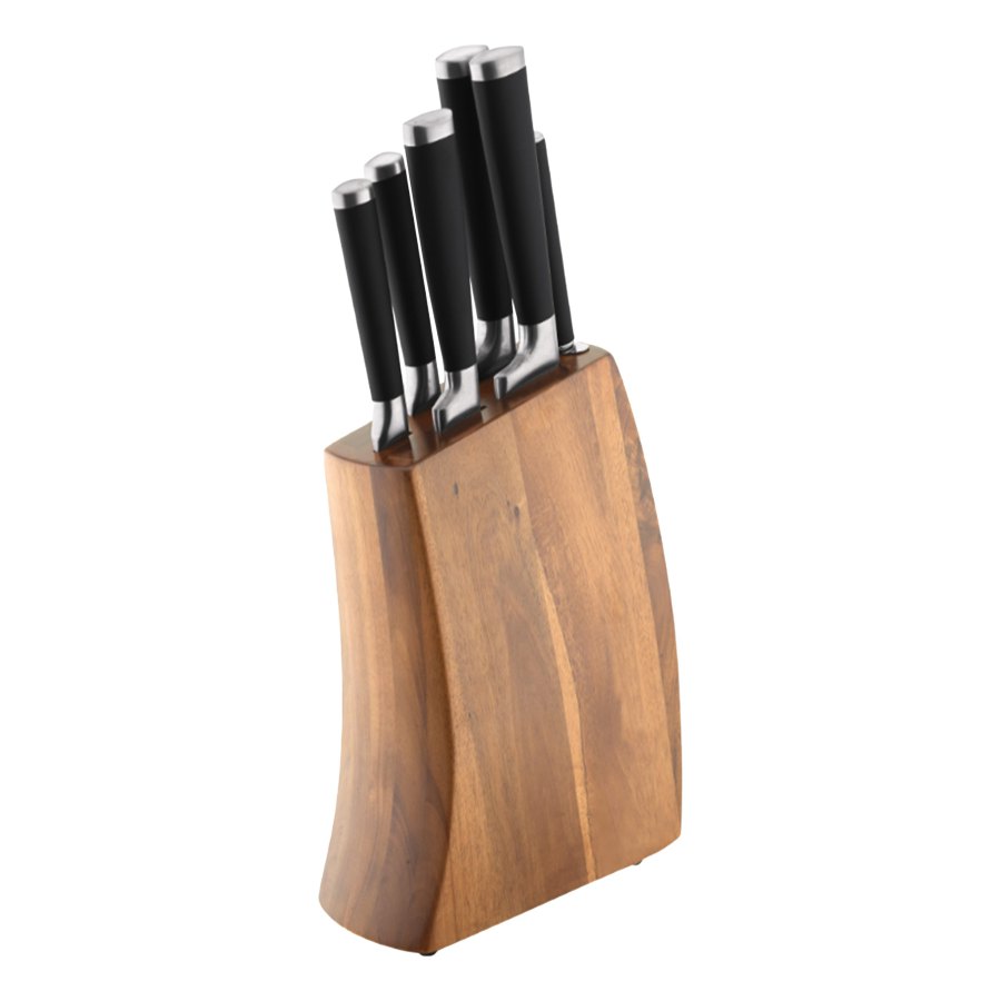 CU02 Juego de Cuchillos de 7 piezas con bloque de madera. Material cuchillos: Hoja SS3CR14 Mango SS430+revestimiento TRP Acero de Afilado: Acero de carbono +SS430+revestimiento TPR Cuchillo de Chef de 20 cms. (T2.5 mm) Cuchillo Santoku de 18 cms. (T2.5 mm) Cuchillo de pan de 20 cms. (T2.5 mm) Cuchillo multiuso de 12,7 cms. (T2.0 mm) Cuchillo pelador de 8,9 cms. (T2.0 mm) Cuchillo de afilar de 20 cms. Bloque de madera de acacia Tamaño Cerrado 35,5 cms x 10,5 cms. Embalaje 1 und. Embalaje Master 4 unds. Tamaño Caja Master 43,6 x 26,5 x 38 cms. Peso Caja Master 14,66 Kg. Opciones de Personalización