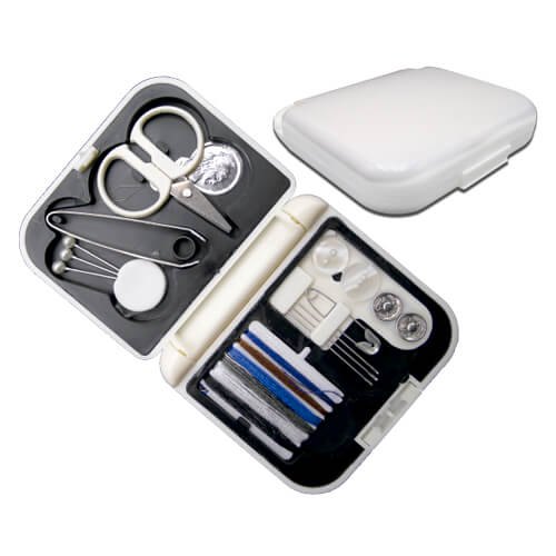 VA15 Set de costura en estuche de PVC color blanco. Incluye pinza, pasadores de bola, tijera, hilo de algodón multicolor, agujas de coser, botones de repuesto, botones de presión, pasador y enhebrador. Presentación en caja individual de cartulina blanca 1 pinza pequeña 6 rollos de hilo de algodón multicolor 1 tijera 3 agujas de coser 2 botones de repuesto 2 botones a presión 1 enhebrador de aguja 1 pasador Tamaño estuche 6,8 cms x 6,5 cms x 1,5 cms. Presentación Caja Cartón Blanca. Embalaje 1 Set. Embalaje Master 500 Sets. Tamaño Caja Master 40 x 40 x 35 cms. Peso Caja Master kgs. Opciones de Personalización